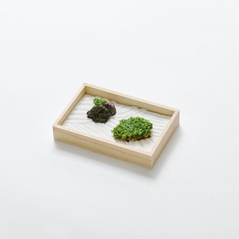 フリーズドライ苔1種、庭石(富士山の溶岩使用)、白砂、木製棒(砂紋作成用)、木箱